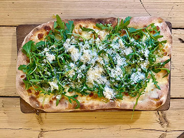 Bianca Base, Mozzarella, Smoked Provola, Gorgonzola, Parmesan and wild rocket salad, Evoo