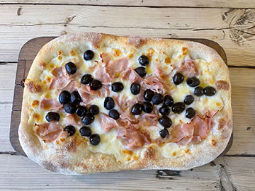Bianca base, Mozzarella, Ham, Black Olives, White truffle Evoo
